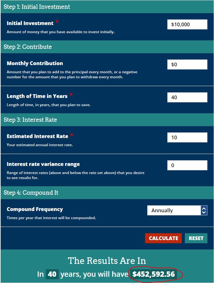 As you can see, if you don’t contribute any other money besides the initial $10,000, earn 10% every year, and let the money grow for 40 years, that $10,000 ends up being worth $452,592.56! By now, you are bringing in $45,259.25 each year in income from your dividends.